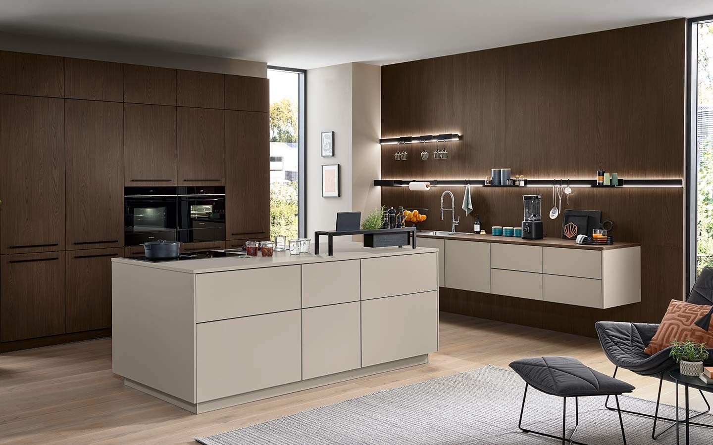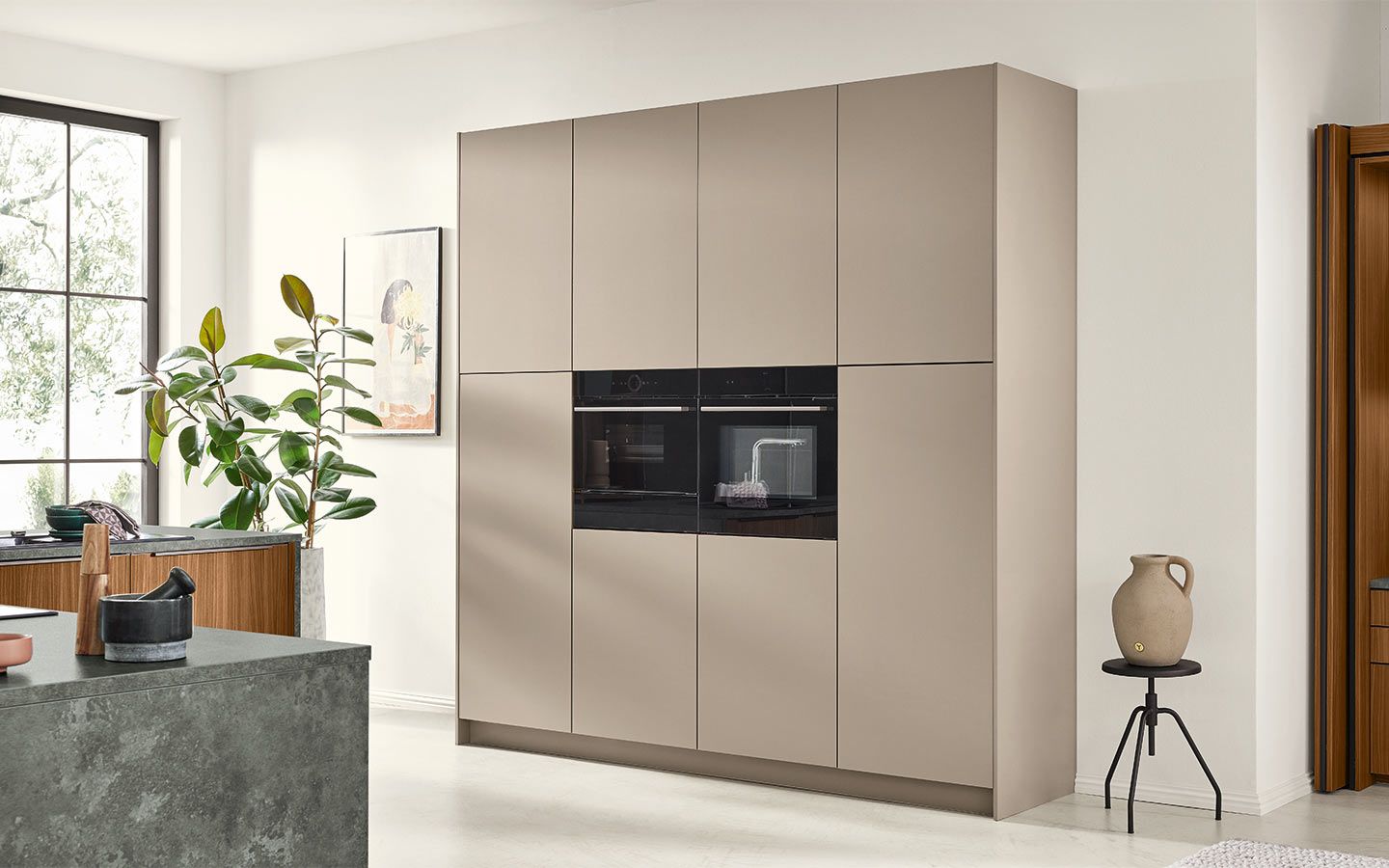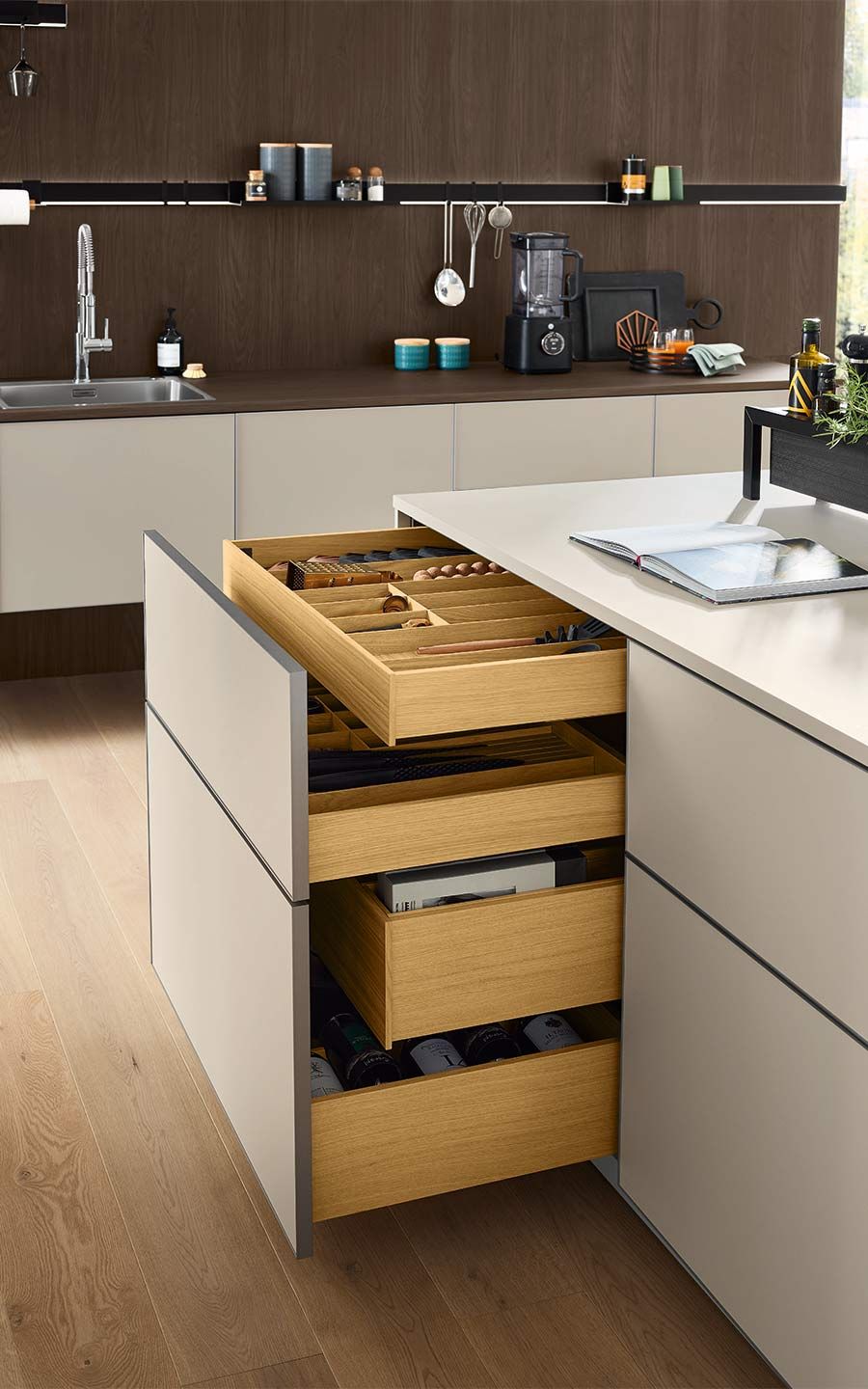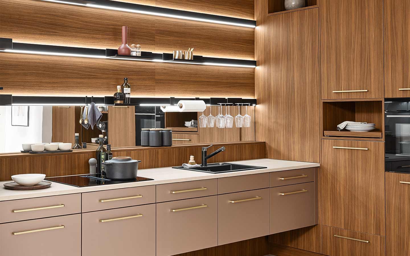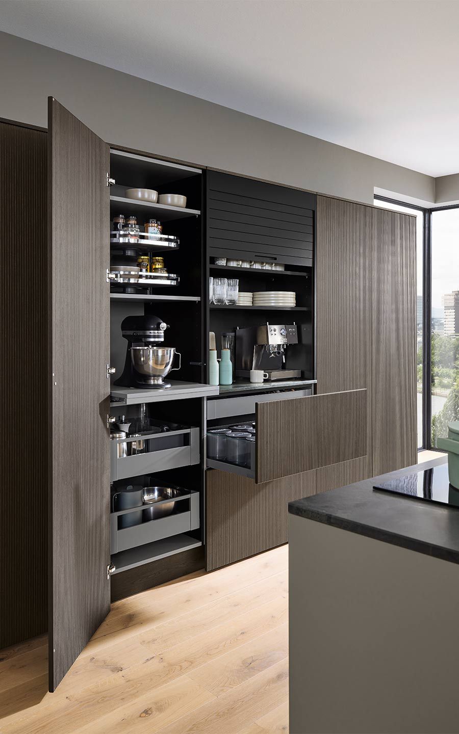 Bei der Planung wurde an alles gedacht: vom perfekt organisierten Stauraum bis hin zum Kühlschrank mit Klimazonen für die optimale Aufbewahrung aller Lebensmittel. Zusätzlich gibt es zahlreiche weitere clevere Details. Dazu gehören zum Beispiel ein Vorratsschrank mit integrierten, verschließbaren Behältern, ausziehbare Schrankböden, die zusätzliche Arbeitsfläche schaffen, großzügige Auszüge für Obst und Gemüse mit transparenten Glasdeckeln oder ein speziell beleuchtetes Regal für Küchenkräuter.
