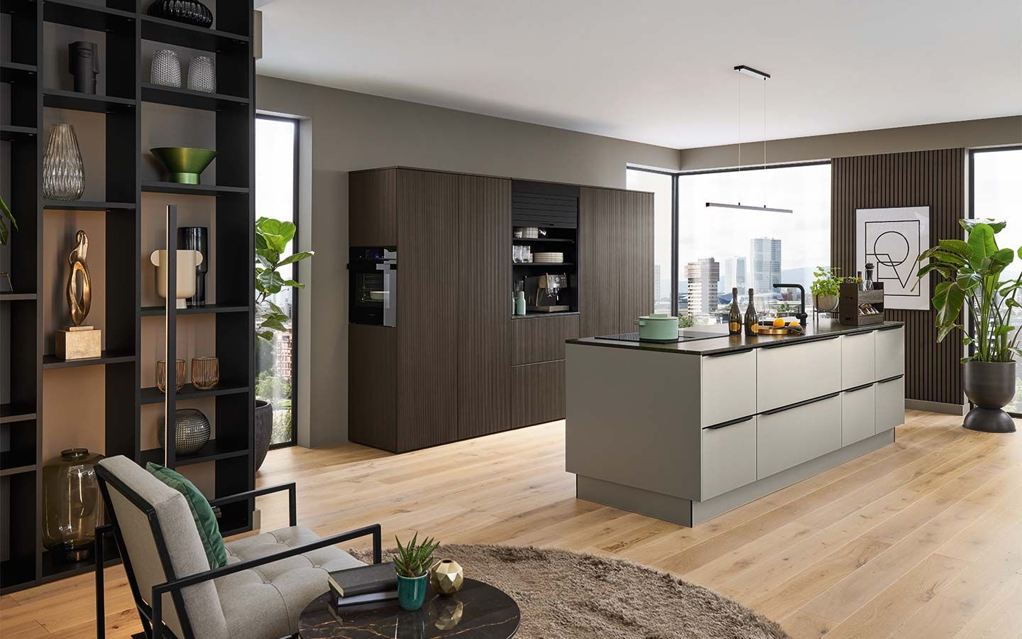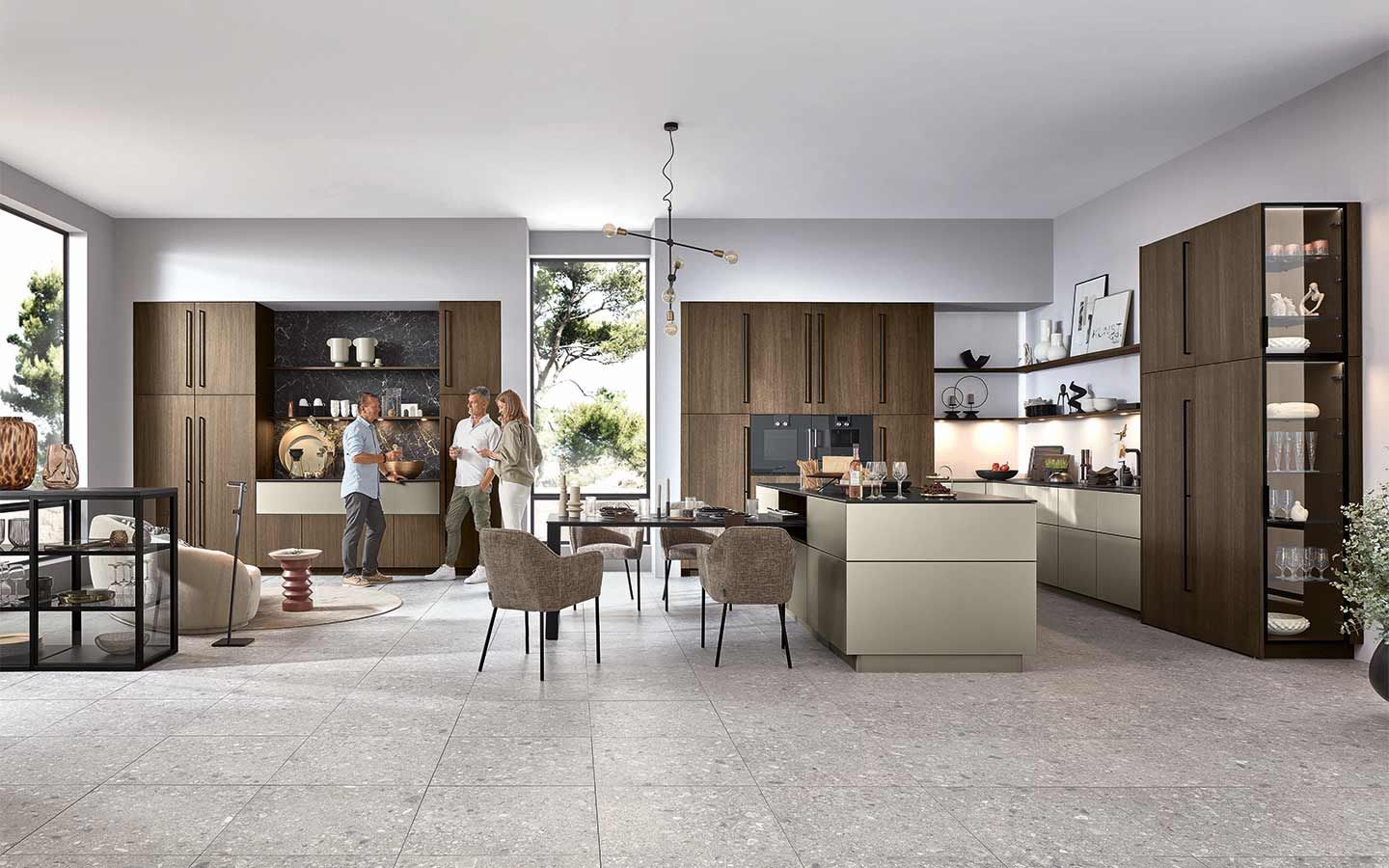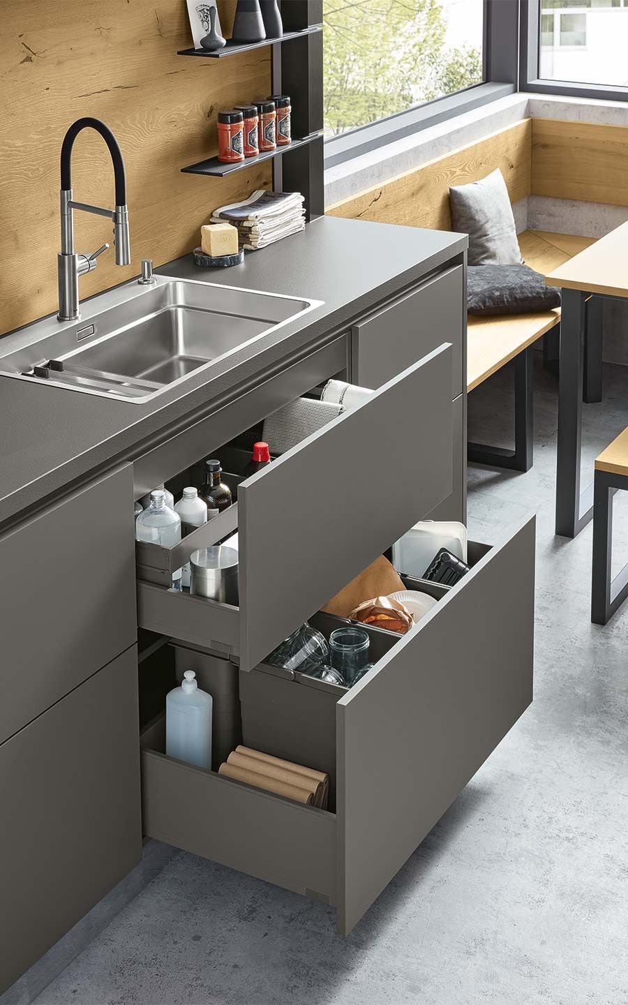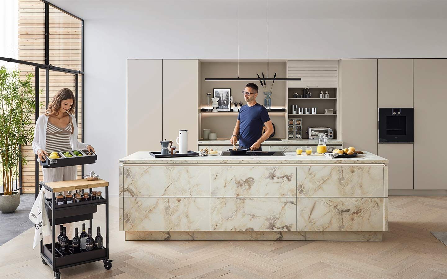 Bei der Planung wurde an alles gedacht: vom perfekt organisierten Stauraum bis hin zum Kühlschrank mit Klimazonen für die optimale Aufbewahrung aller Lebensmittel. Zusätzlich gibt es zahlreiche weitere clevere Details. Dazu gehören zum Beispiel ein Vorratsschrank mit integrierten, verschließbaren Behältern, ausziehbare Schrankböden, die zusätzliche Arbeitsfläche schaffen, großzügige Auszüge für Obst und Gemüse mit transparenten Glasdeckeln oder ein speziell beleuchtetes Regal für Küchenkräuter.