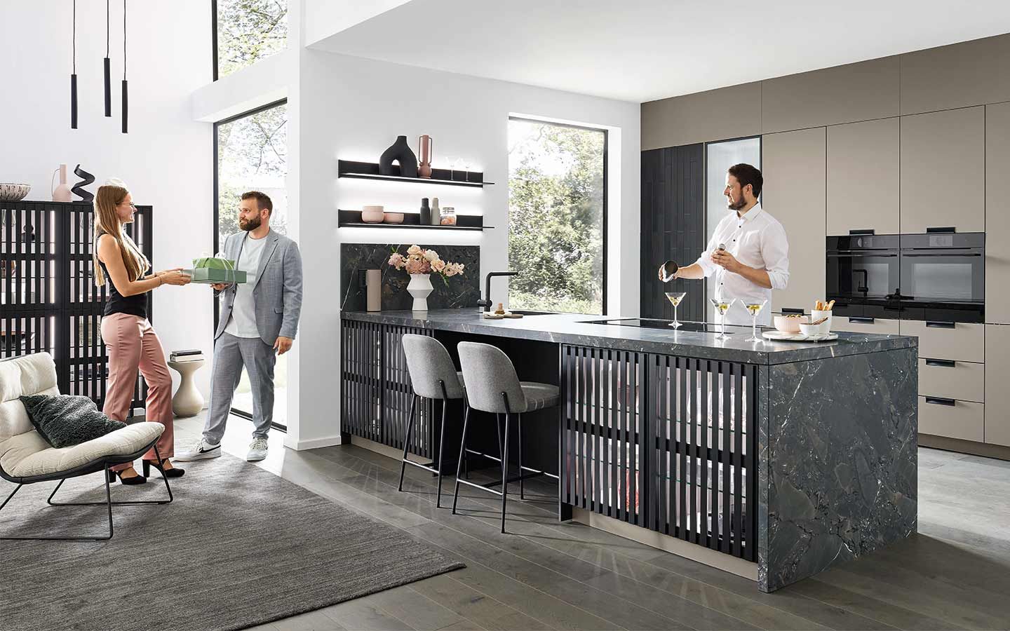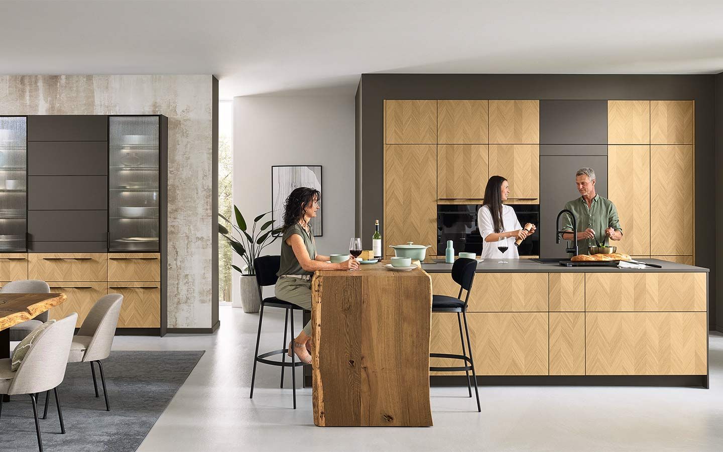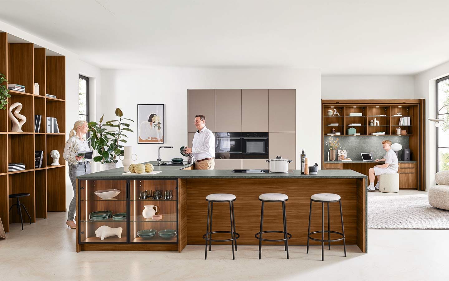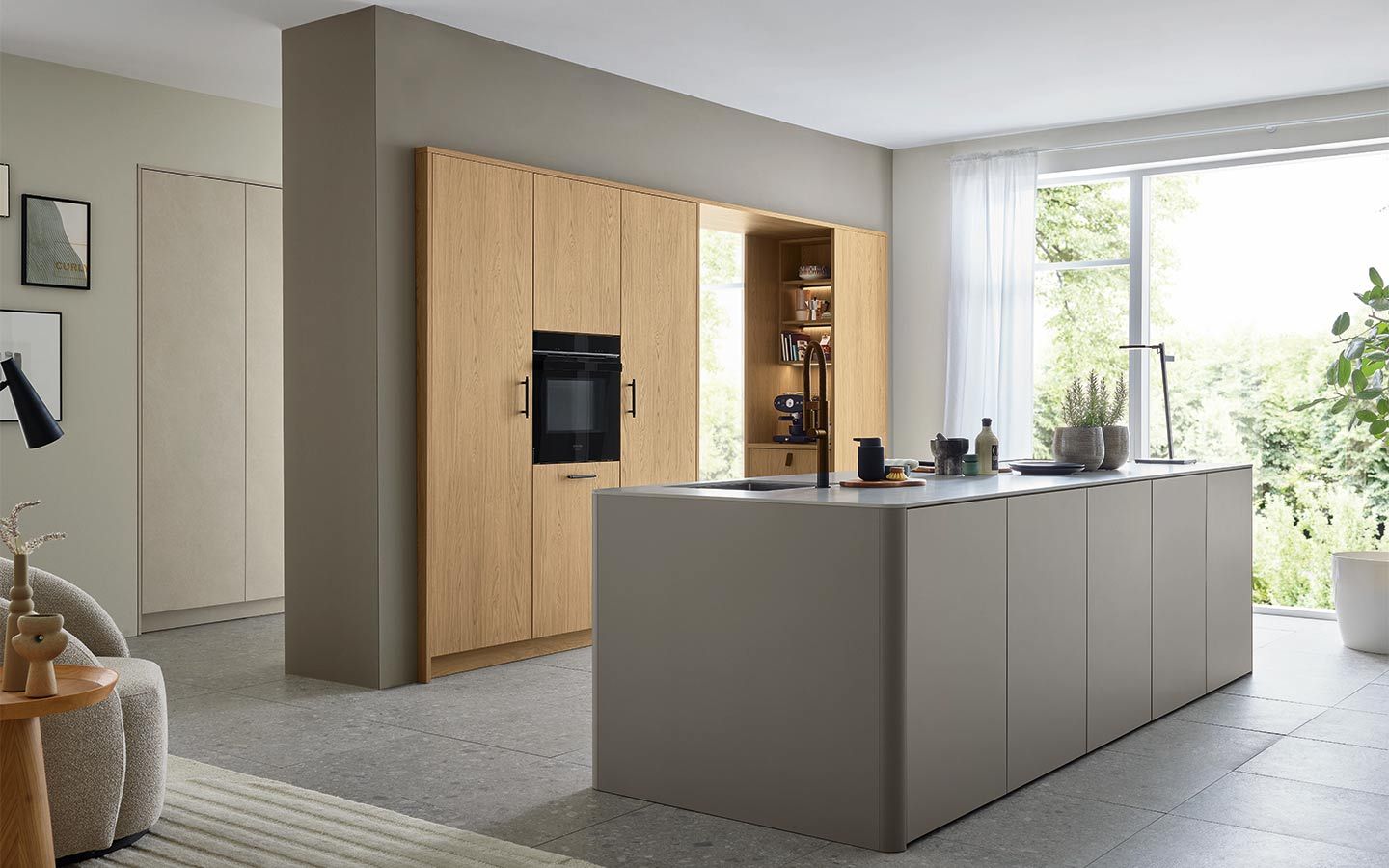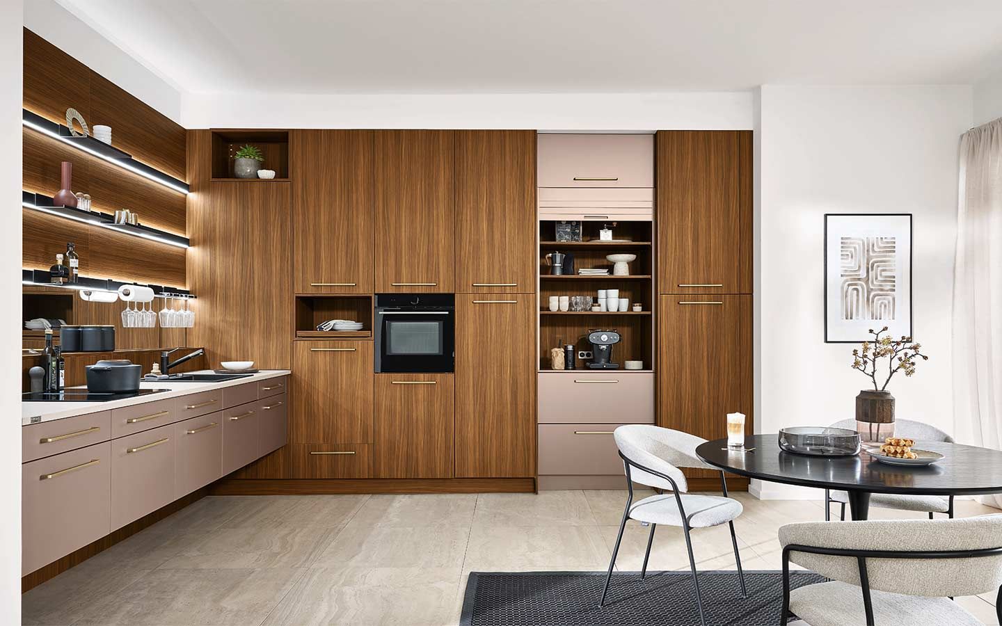 Bei der Planung wurde an alles gedacht: vom perfekt organisierten Stauraum bis hin zum Kühlschrank mit Klimazonen für die optimale Aufbewahrung aller Lebensmittel. Zusätzlich gibt es zahlreiche weitere clevere Details. Dazu gehören zum Beispiel ein Vorratsschrank mit integrierten, verschließbaren Behältern, ausziehbare Schrankböden, die zusätzliche Arbeitsfläche schaffen, großzügige Auszüge für Obst und Gemüse mit transparenten Glasdeckeln oder ein speziell beleuchtetes Regal für Küchenkräuter.